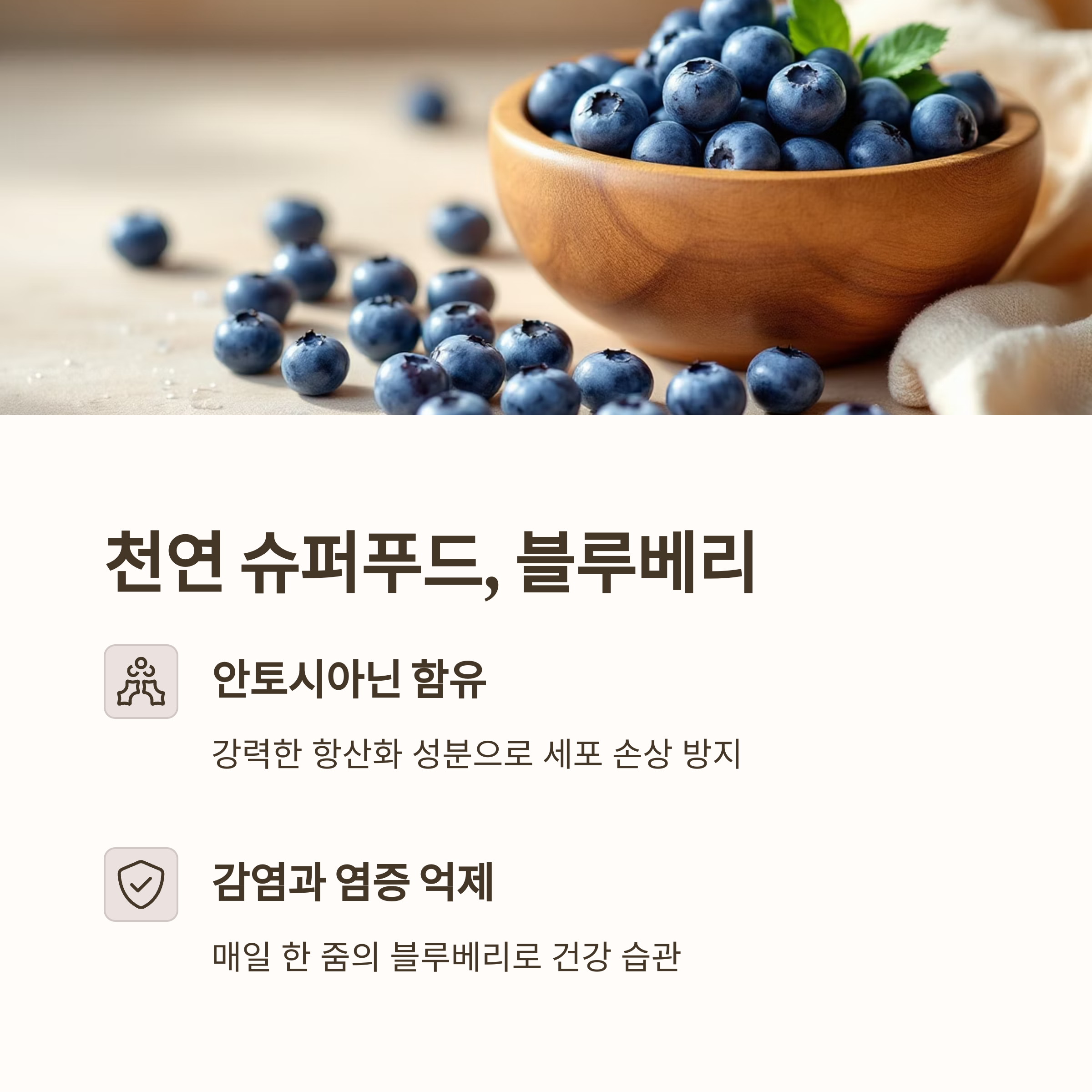 블루베리는 안토시아닌이라는 항산화 성분이 풍부하여 세포 손상을 방지합니다.