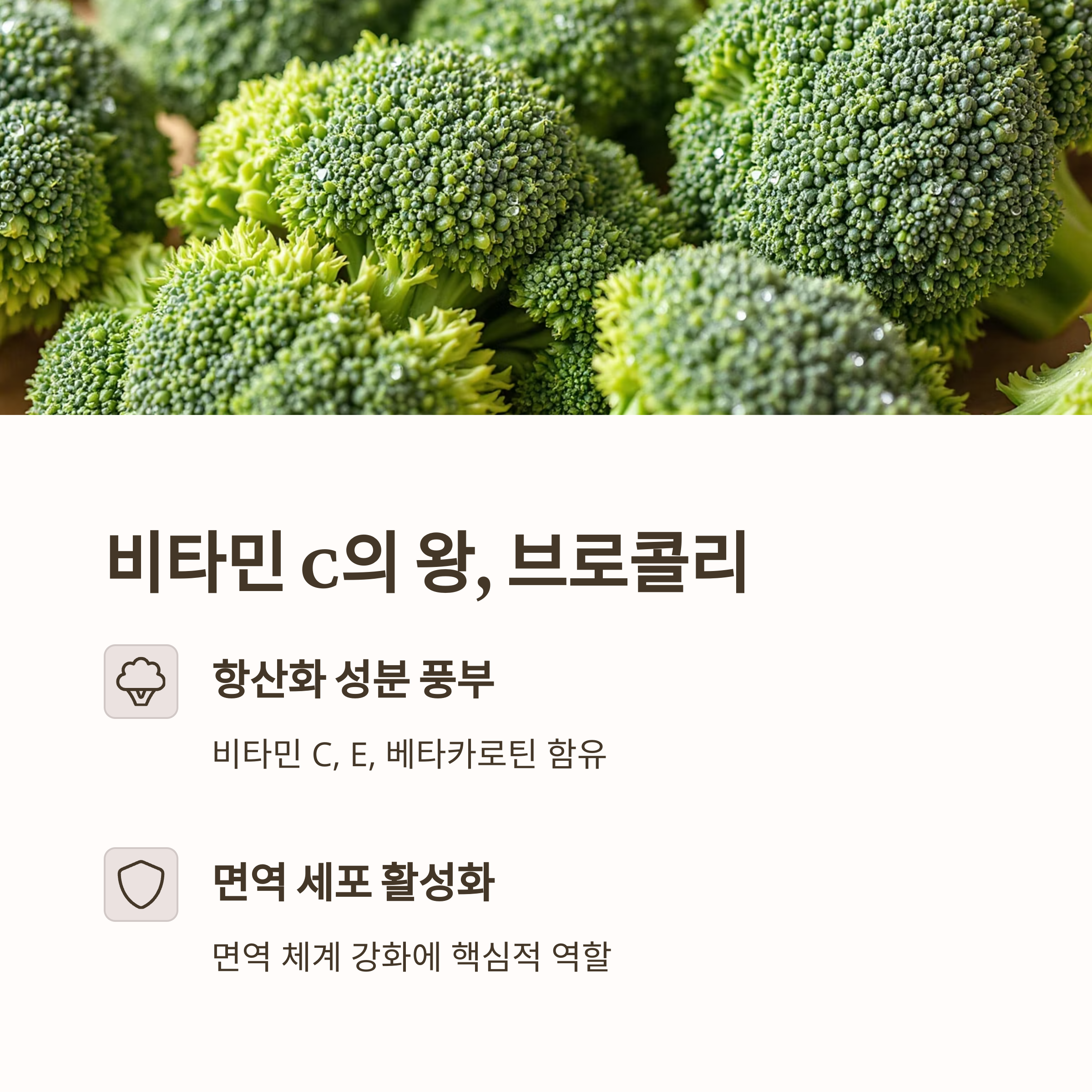 | 브로콜리 | 비타민 C, E | 항산화 작용, 면역세포 활성화 |