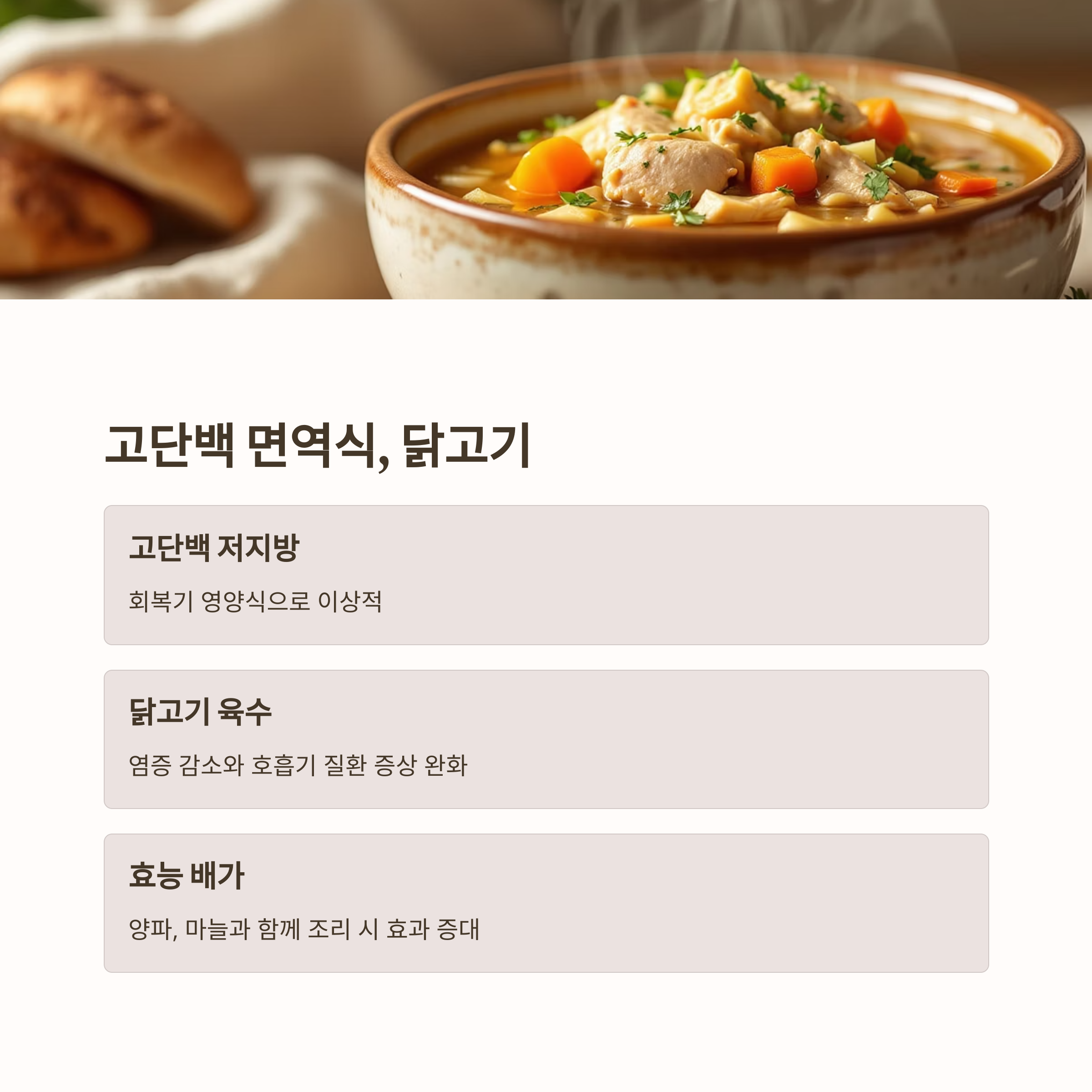 특히 닭고기 육수는 염증을 줄이고 호흡기 질환 증상을 완화하는 데 효과적입니다.