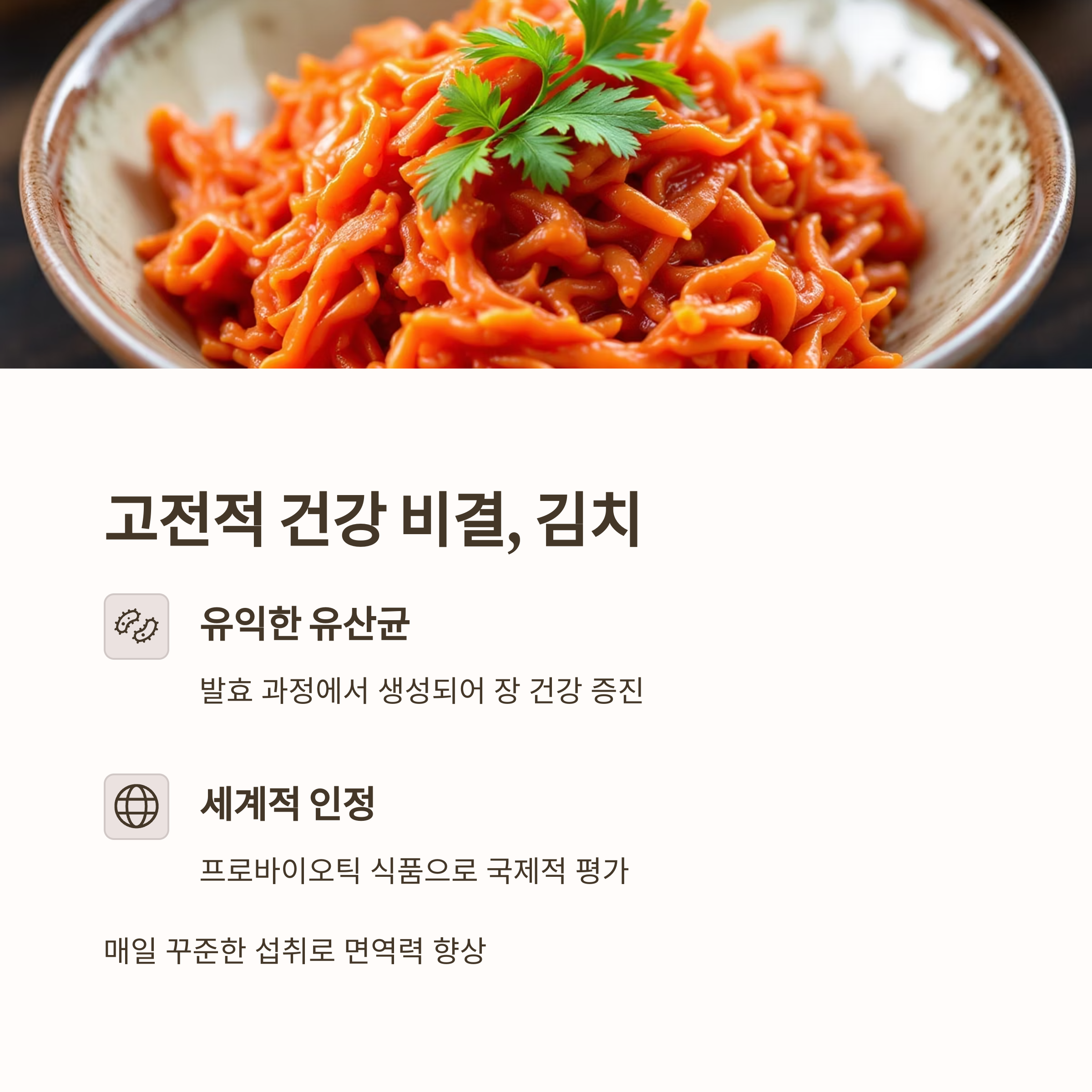 한국인의 전통 음식이지만 전 세계적으로도 프로바이오틱 식품으로 인정받고 있습니다.