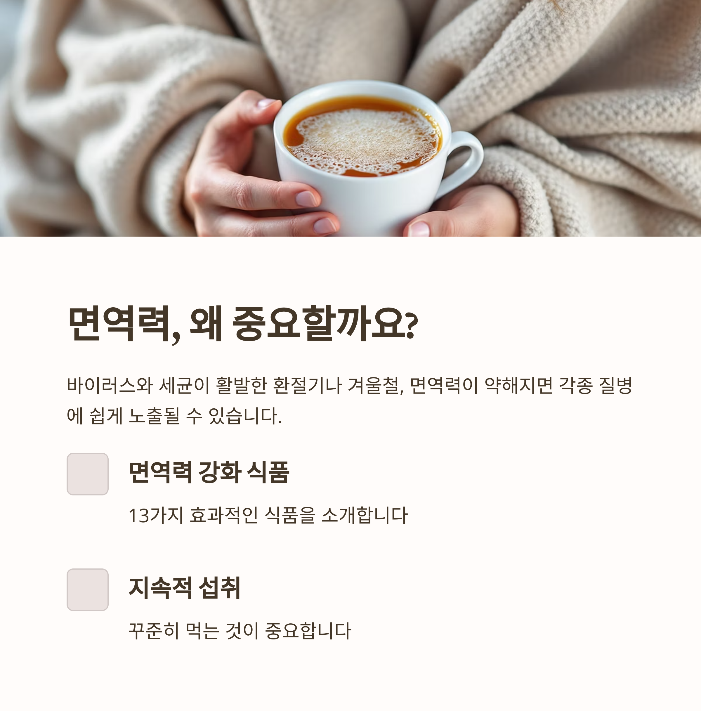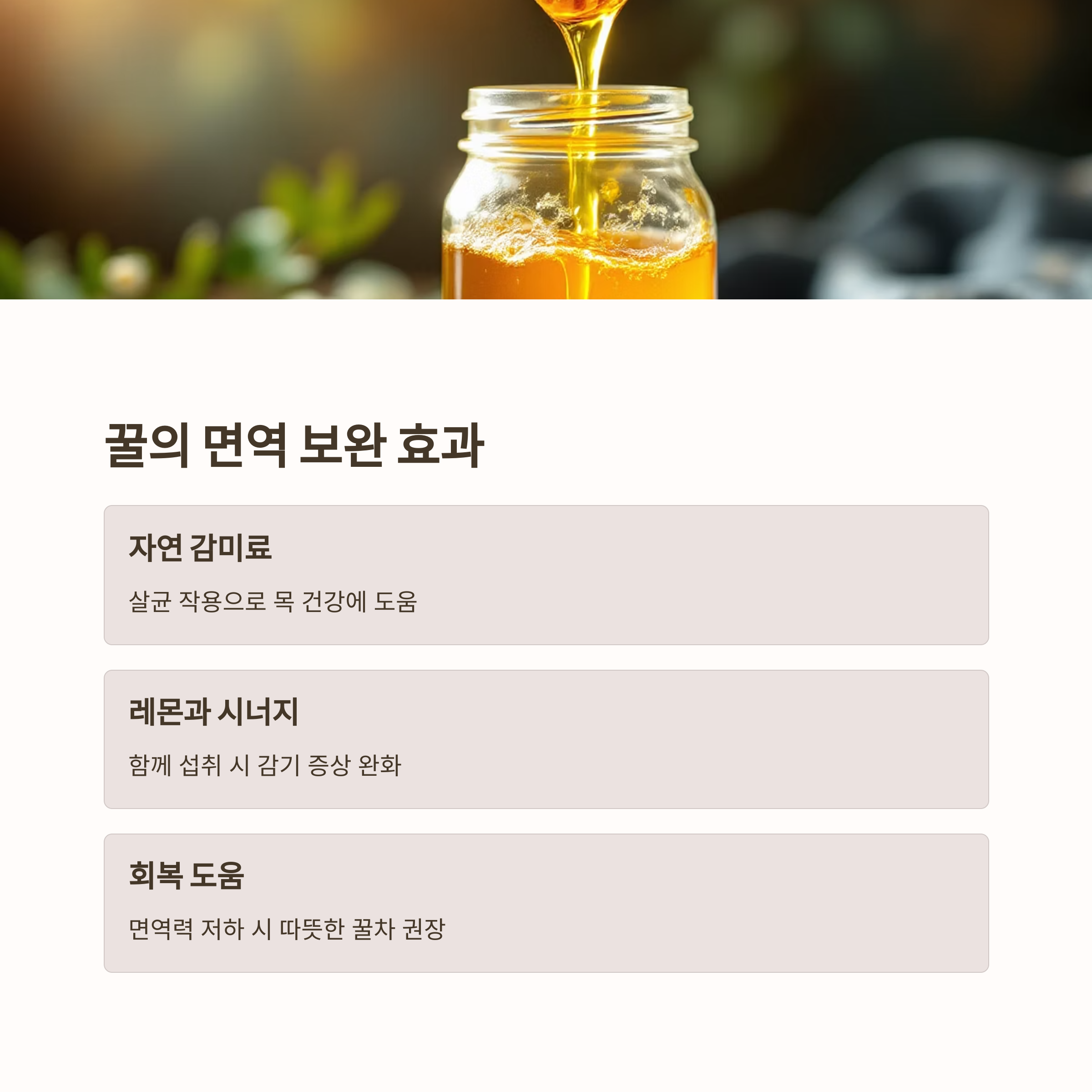 "면역력 저하가 느껴질 때 따뜻한 꿀차 한 잔"이 회복을 도와줍니다.