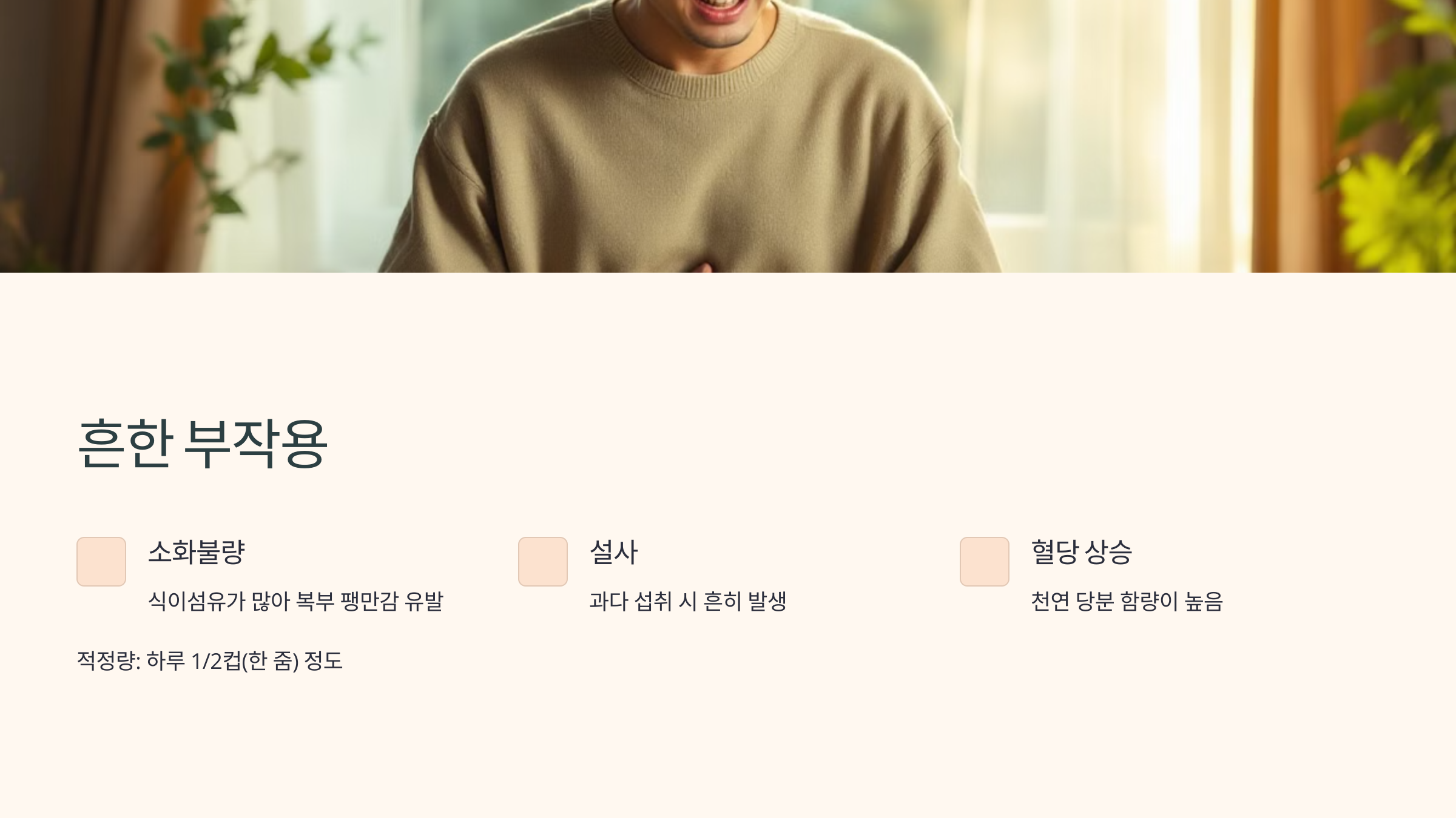 식이섬유가 많기 때문에 복부 팽만감, 가스 참, 설사 같은 증상이 생기기 쉽답니다.