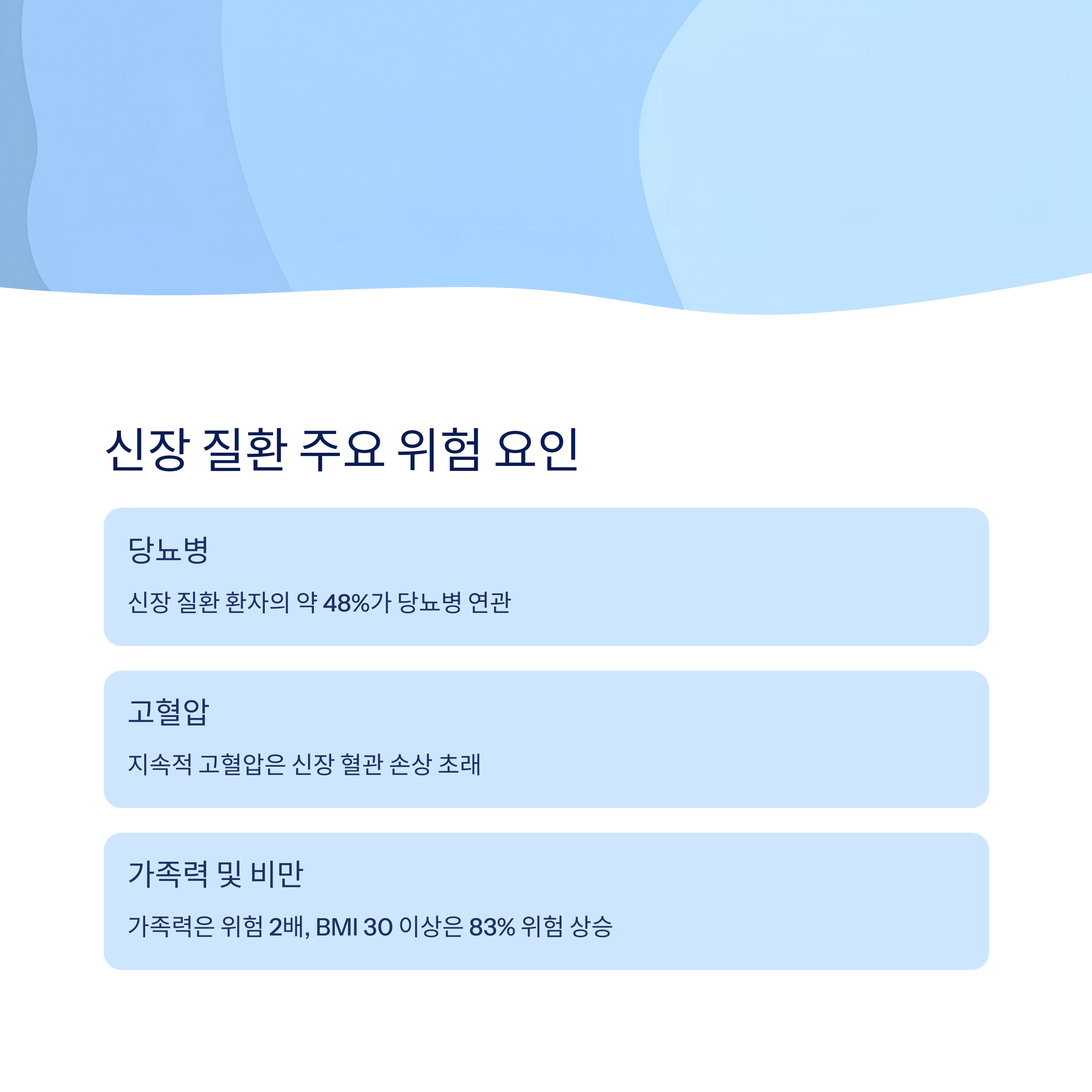 | 가족력 | 신장 질환 가족력은 위험을 2배 증가시킴 |