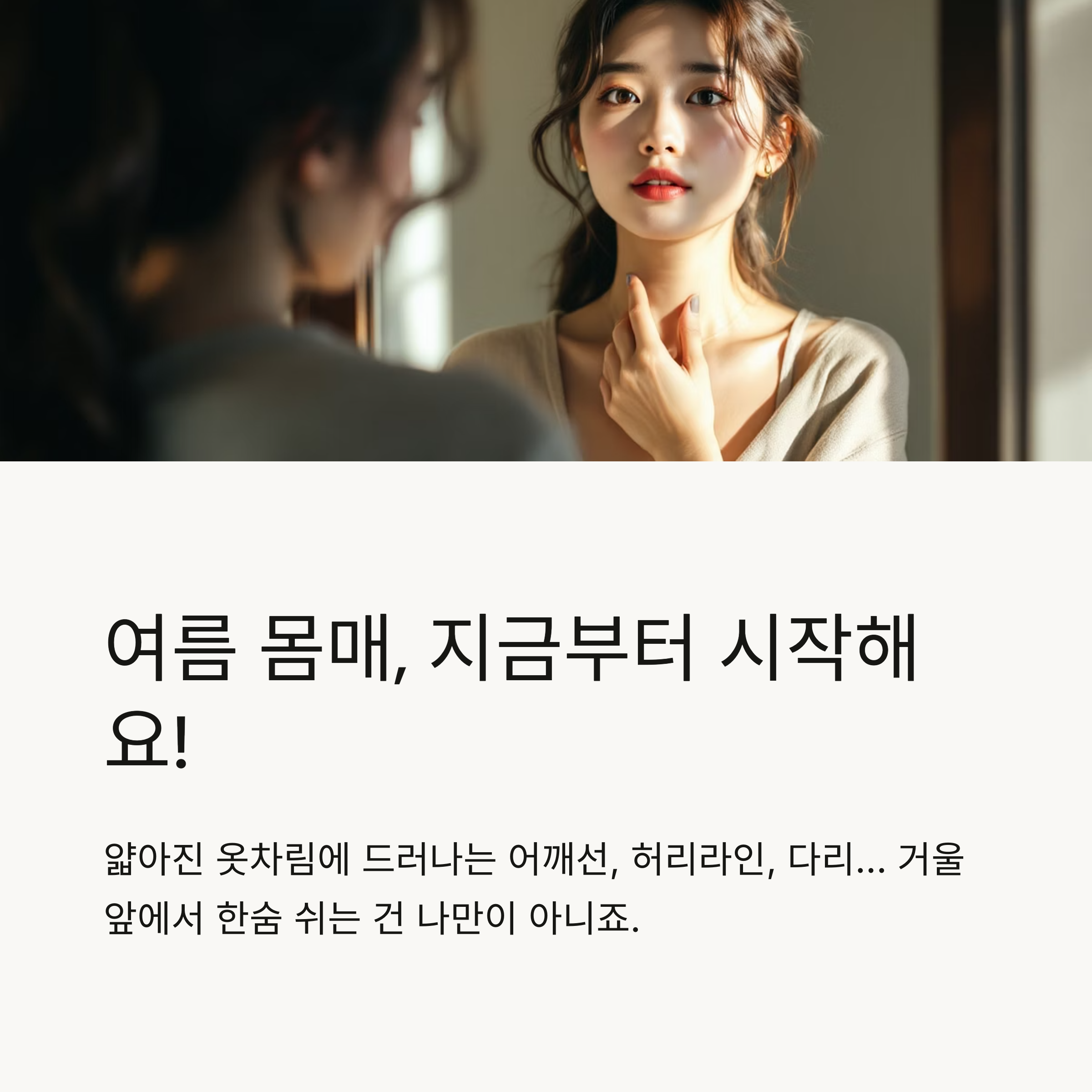 오늘부터 가볍게라도 시작해. 1잔의 물, 10분의 운동, 하나의 건강한 식사. 그게 쌓이면 이번 여름엔 진짜 자신감 있는 나를 만날 수 있을 거야.