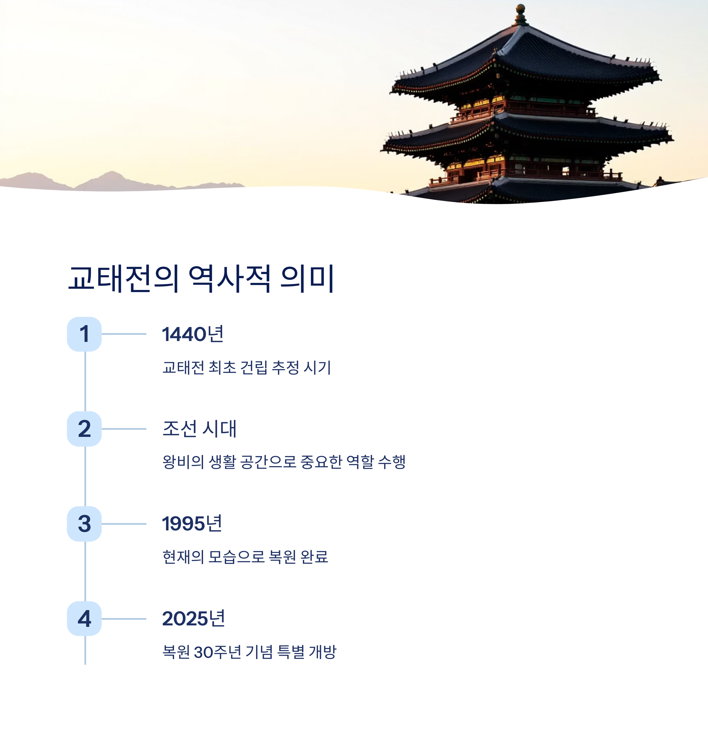 교태전은 1440년에 창건된 것으로 추정되며, 조선 왕비의 정치적·상징적 역할을 보여주는 공간입니다. 1995년 복원 이후 30년 만의 공개라는 점에서 그 가치는 더욱 특별합니다.