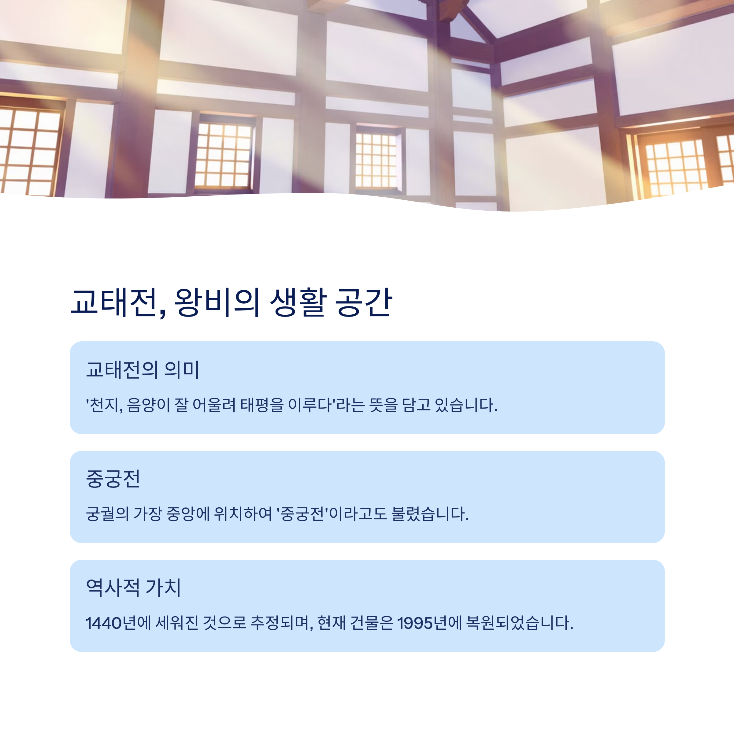 교태전은 조선 왕비의 생활공간이자, 궁궐의 중심부를 지키던 중요한 전각입니다. 이번 기회를 통해 역사적 의미와 함께 그 안에 숨겨진 미적 가치를 직접 체험해 보세요.