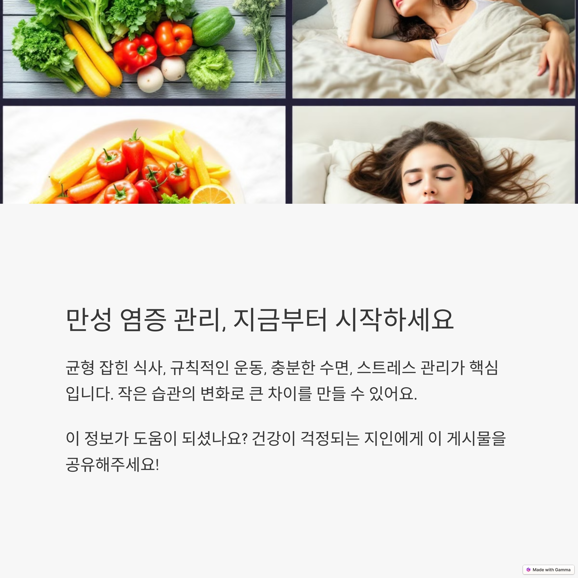 만성 염증은 단기간에 해결할 수 있는 문제가 아닙니다. 하지만 올바른 식습관과 생활 습관을 꾸준히 실천하면 염증 수치를 낮추고 건강한 삶을 유지할 수 있습니다.