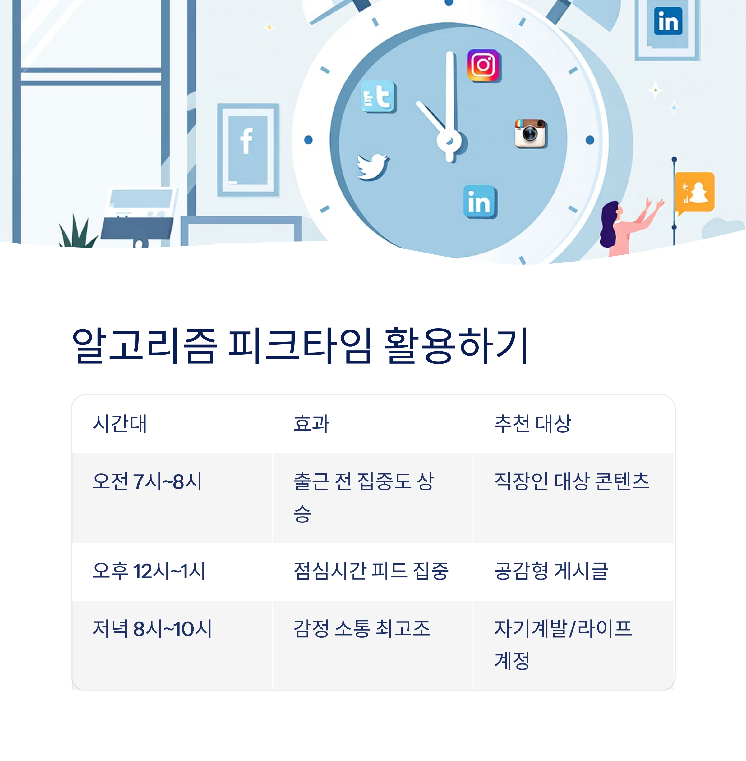| 저녁 8시~10시 | 감정 소통 최고조 | 자기계발/라이프 계정 |