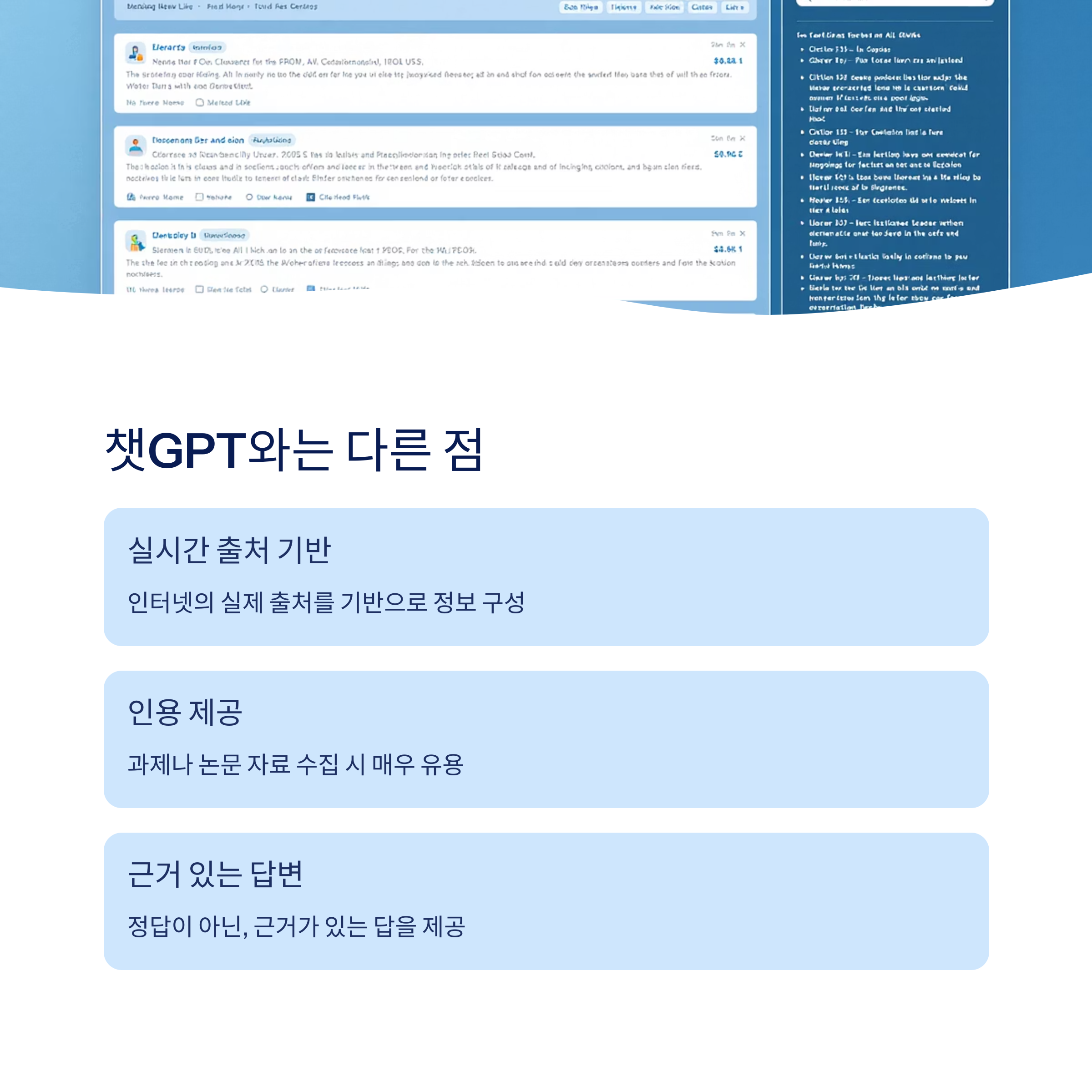 인터넷의 실제 출처를 기반으로 정보를 구성하고 인용까지 제공하는 구조입니다.