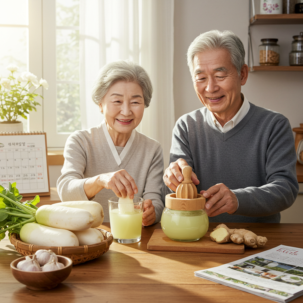 무즙은 체질과 상황에 맞게 다양하게 조절해 마실 수 있으며, 부작용도 거의 없어 안전하게 장기간 섭취할 수 있는 자연 건강 식품입니다. 무즙을 통해 면역력과 소화기 건강을 동시에 챙길 수 있다면, 장년기의 건강관리에 있어 더없이 훌륭한 선택이 될 것입니다.